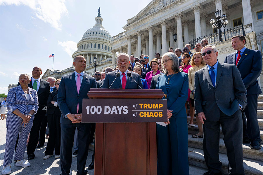 El 30 de abril (día 101 de la presidencia de Trump), los líderes demócratas del Senado y de la Cámara de Representantes, Chuck Schumer (D–NY) y Hakeem Jeffries (D–NY), junto con demócratas de ambas cámaras, dijeron en rueda de prensa que los primeros 100 días del presidente han sido un “…Fracaso… en la economía… en la reducción de costos… en los aranceles…en la política exterior, …en la preservación de la democracia,…en ayudar a las familias de clase media…”.