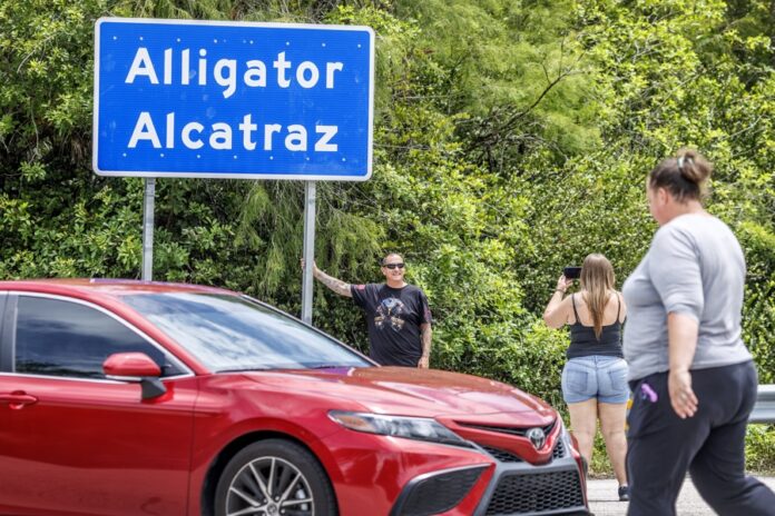 Turistas se fotografiaban desde este fin de semana bajo el letrero de ‘Alligator Alcatraz’ que colocó el Gobierno de Florida hace dos semanas para marcar la apertura del centro de detención en un aeropuerto abandonado al oeste de Miami rodeado de caimanes, pitones, panteras y pantanos.