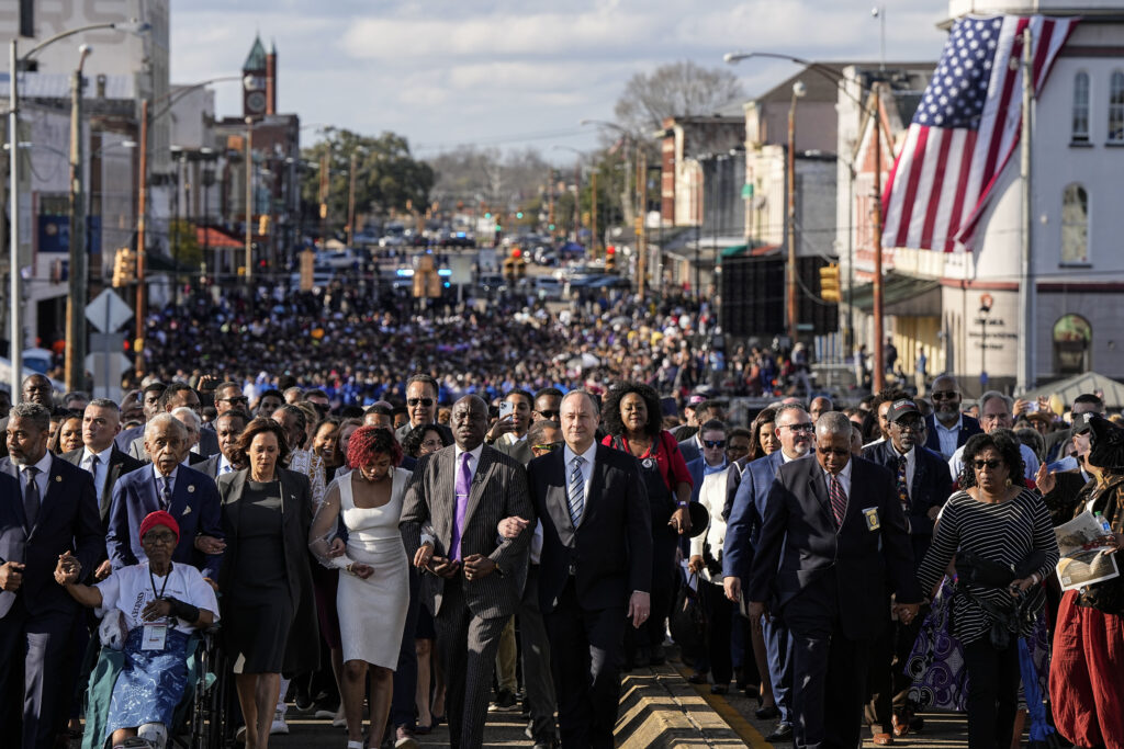 Bajo un cielo resplandecientemente azul, posteriormente Harris encabezó a una multitud a través del puente Edmund Pettus en la marcha que pone fin a la conmemoración anual. Miles de personas la siguieron, en ocasiones cantando himnos del movimiento por los derechos civiles, como “Ain’t Gonna Let Nobody Turn Me ’Round” («No voy a permitir que nadie me haga volverme»).