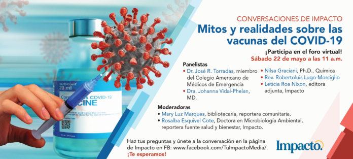 El foro virtual transmitirá el sábado 22 de mayo, y tendrá como panelistas a dos reconocidos médicos, el Dr. José R. Torradas, miembro del Colegio Americano de Médicos de Emergencia y portavoz de esa organización, y la Dra. Johanna Vidal-Phelan, Directora Médica Senior de Pediátrica para UPMC. También participarán miembros del equipo editorial de Impacto, la Dra. Nilsa Graciani, el Rev. Robertoluis Lugo-Morciglio y su servidora en mi veste de editora adjunta. Los panelistas estarán disponibles para contestar sus preguntas.