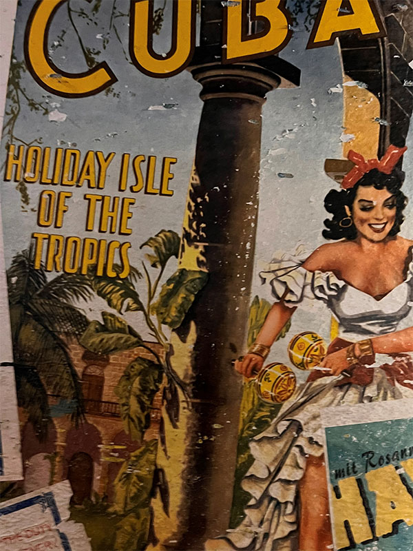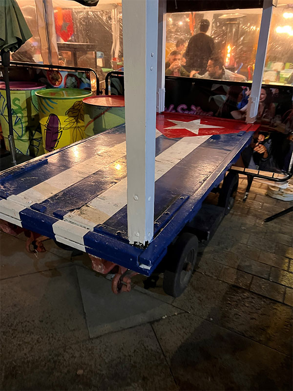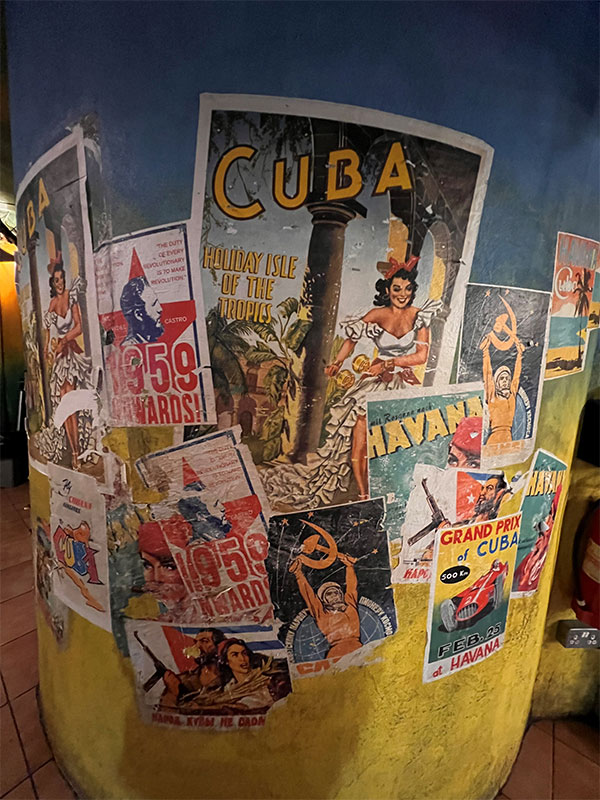 Cubana is a restaurant located on a corner property of a street that is open only to pedestrians. Familiar island objects framed the entrance – A carreta with a Cuban flag painted on it and hibiscus flowers everywhere. A large outside seating area is the prelude to a movie set interior with vintage posters pasted on the multi-colored walls.