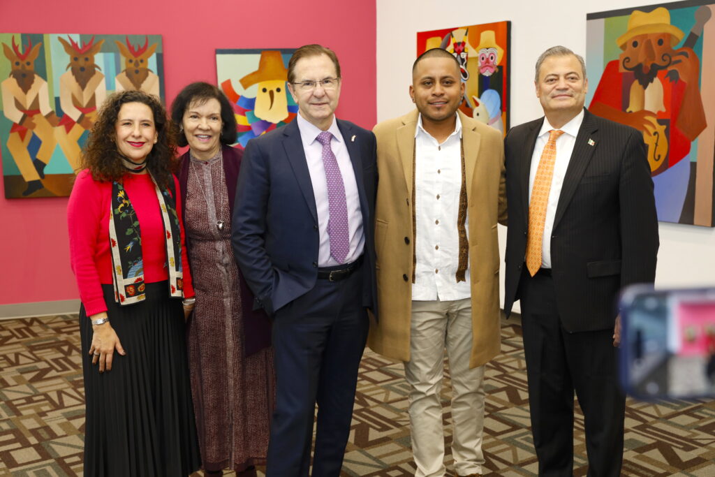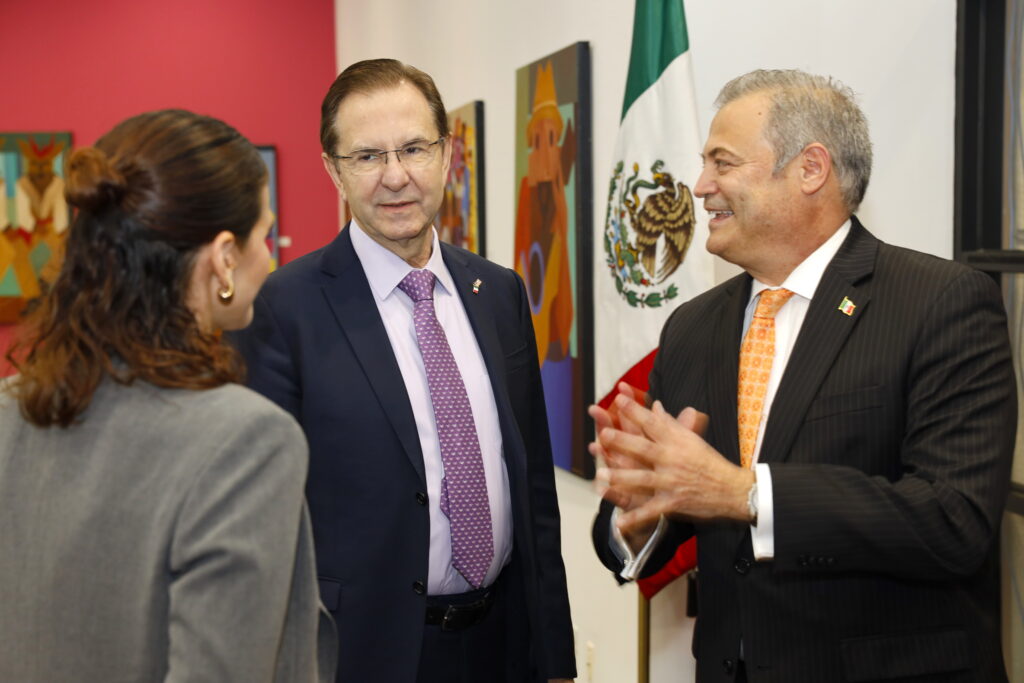 El evento concluyó con una visita a la Galería Gilberto Owen, espacio cultural integrado al consulado, donde se exhibe la muestra “Entre máscaras y sonidos” del artista oaxaqueño Noé Jacinto. El artista, presente en el acto, conversó con el embajador y su esposa sobre su obra.