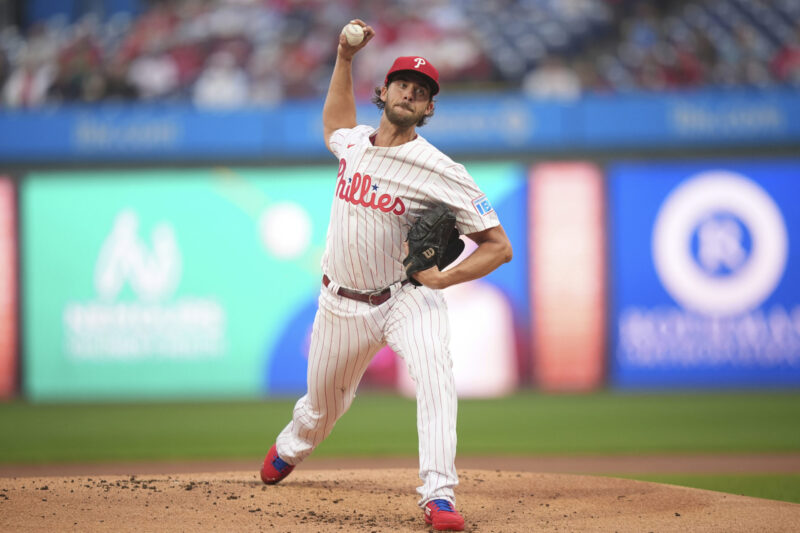 ARCHIVO - Aaron Nola, lanzador de los Filis de Filadelfia, lanza durante el segundo partido de béisbol de una doble cartelera el 14 de mayo de 2025, en Filadelfia. (AP Photo/Matt Slocum, Archivo)