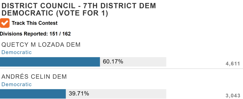 En el Distrito 7 del norte de Filadelfia, que cubre partes de Fairhill, Kensington, Hunting Park, Feltonville, Frankford y Juniata Park, Lozada ganó con el 60% de los votos sobre su retador Andrés Celin. Quetcy, quien tiene una gran trayectoria generacional en esa área de la ciudad, asumió el escaño recientemente después de ganar una elección especial en noviembre pasado para reemplazar a su exjefa, María Quiñones Sánchez, quien renunció para lanzar una campaña para la alcaldía, que interrumpió el 9 de abril, y después le diera su apoyo a Cherelle Parker, quien resultara la ganadora de las primarias.