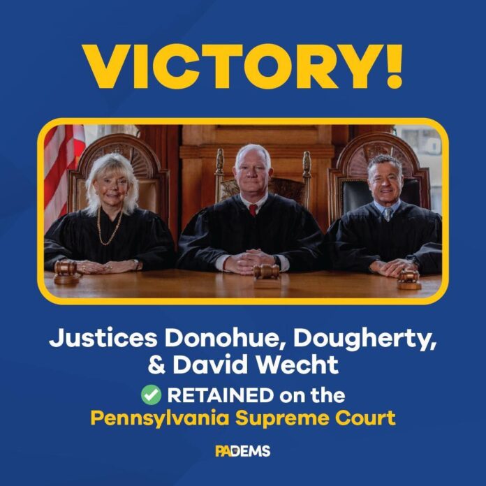 PENNSILVANIA — Los votantes del estado decidieron mantener en sus cargos por otros diez años a los jueces demócratas David Wecht, Christine Donohue y Kevin Dougherty, integrantes de la Corte Suprema de Pensilvania. La agencia Associated Press confirmó el resultado, que garantiza la continuidad de la mayoría demócrata (5-2) en el máximo tribunal estatal.