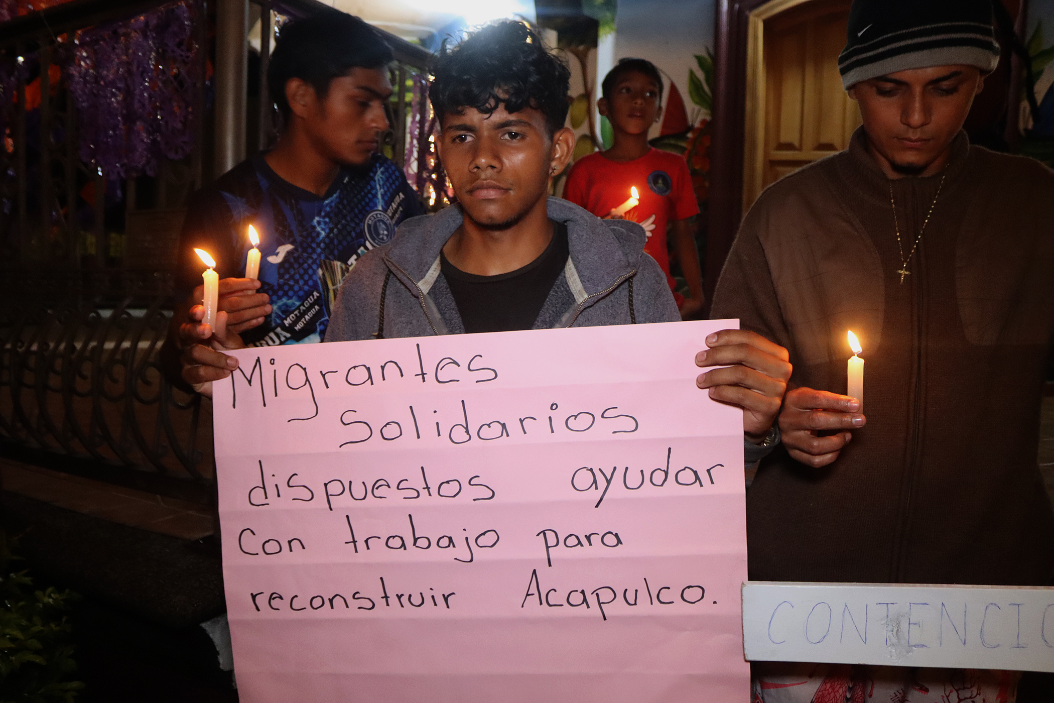 El ofrecimiento llegó en medio de un intensa lluvia en Tapachula provocada por una depresión tropical formada la tarde del sábado en el Pacífico. Por la noche los migrantes cumplieron una vigilia con oraciones, veladoras y cartulinas para solidarizarse con los habitantes del estado de Guerrero.