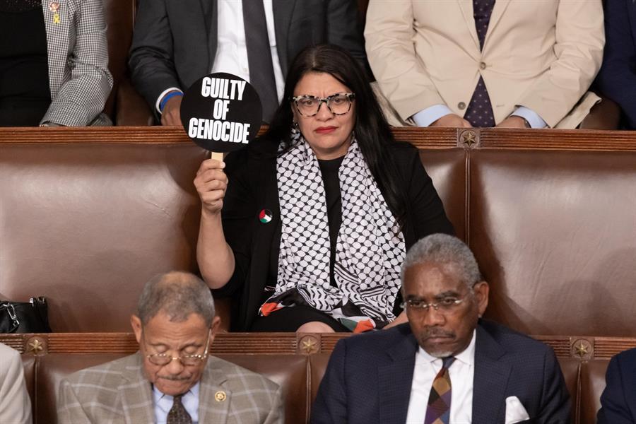 La congresista demócrata de origen palestino Rashida Tlaib llevó durante el discurso del primer ministro israelí, Benjamín Netanyahu, un abanico en el que ponía «criminal de guerra» en señal de protesta.