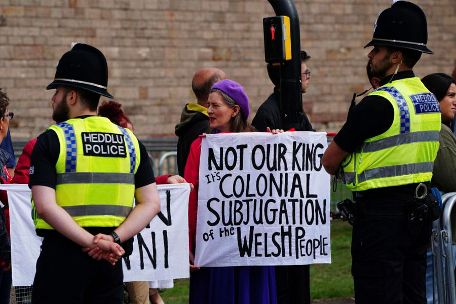 Manifestantes protestan antes de la ceremonia de Proclamación pública del rey Carlos III como nuevo monarca en el castillo de Cardiff, Gales, 11 de septiembre de 2022. El cartel dice en inglés: "No es nuestro rey. Es la subyugación colonial del pueblo galés". (Foto: AP/Ben Birchall/PA)