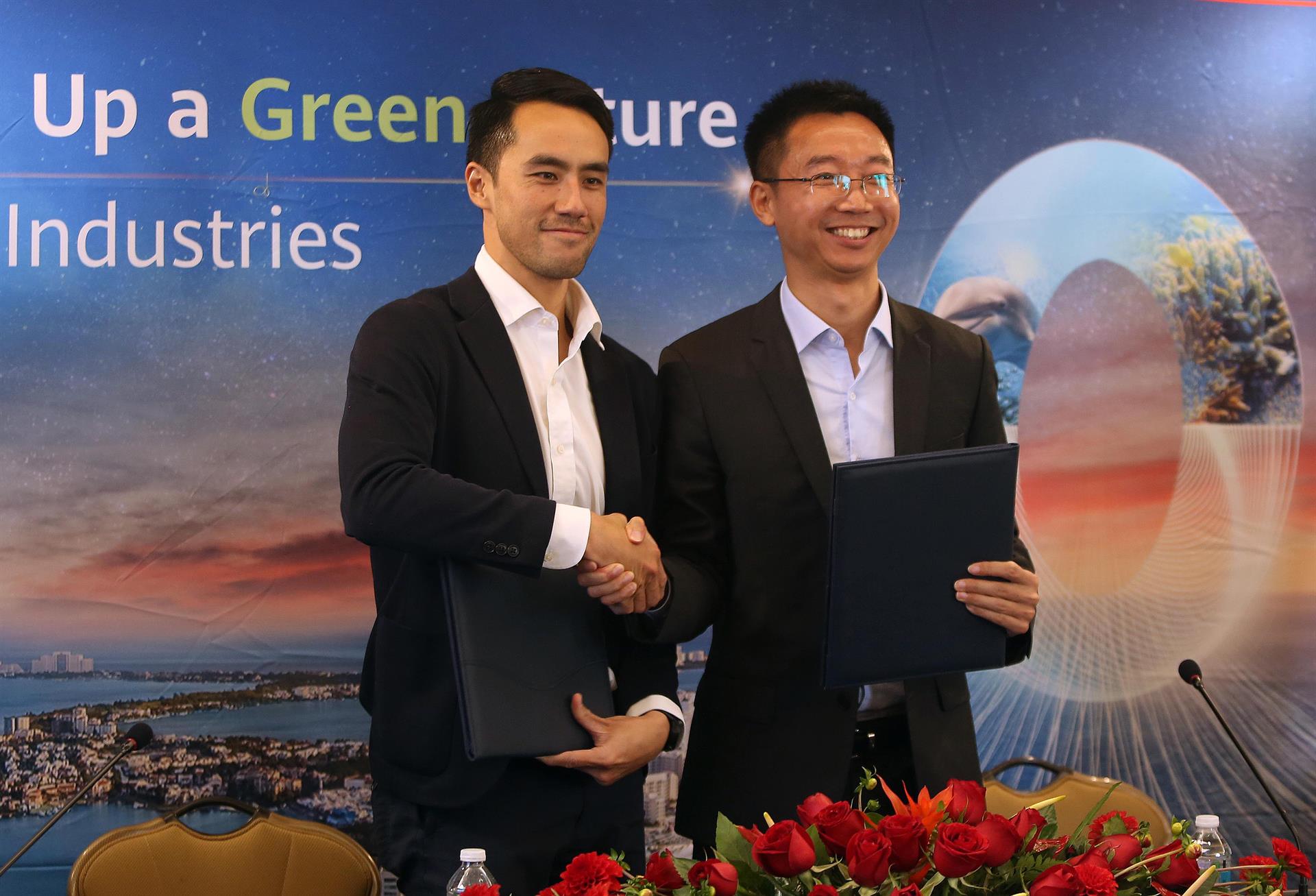 Huawei Digital Power Peru Country Manager Liu Zhixin (r) and Novum Solar General Manager Tomas Luy (l) taking part in the signing of a cooperation agreement between Novum Solar and Huawei Digital Power on Friday in the resort of Cancun the Mexican State of Quintana Roo. EFE/Alonso Cupul