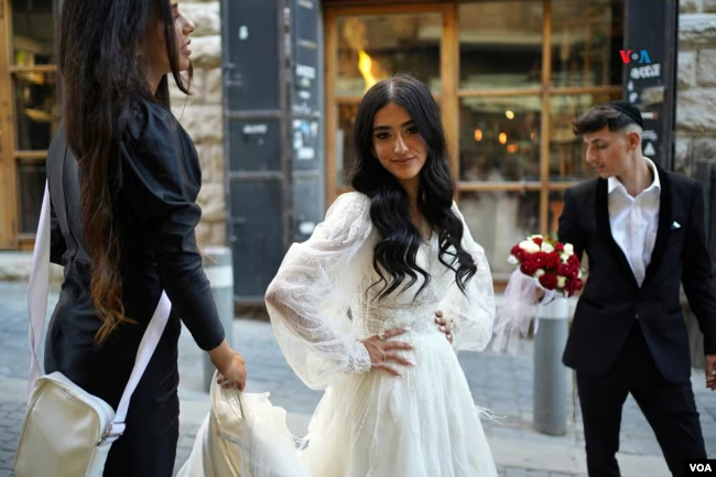 Una pareja de recién casados posa en una céntrica calle de Jerusalén oeste. (Foto: VOA)