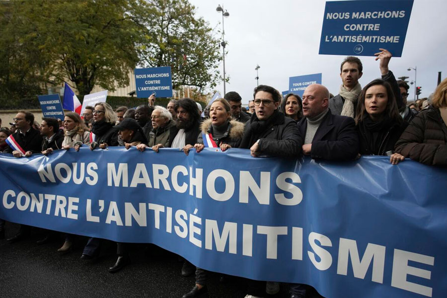 Las autoridades parisinas desplegaron unos 3.000 agentes policiales por toda la ruta de la protesta, convocada por el Senado y la Asamblea Nacional, en medio de un aumento alarmante del antisemitismo en Francia desde que comenzó la guerra entre Israel y Hamás tras el ataque del grupo islamista el 7 de octubre.