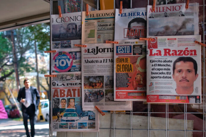 Periódicos expuestos a la venta en Ciudad de México, el lunes 23 de febrero de 2026, un día después de que el ejército mexicano matara al líder del Cártel Jalisco Nueva Generación, Nemesio Oseguera Cervantes, conocido como «El Mencho». (Foto: AP/Jon Orbach)