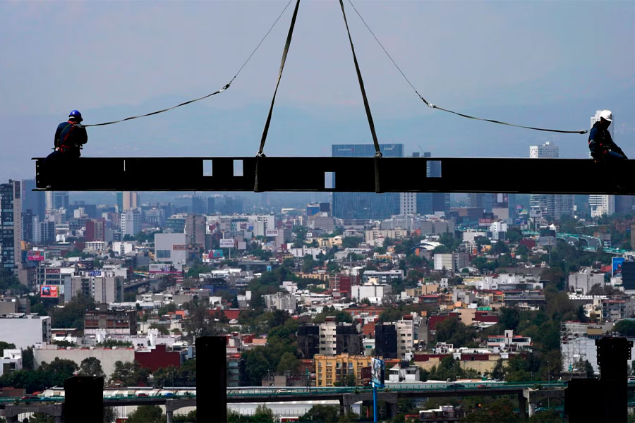 Trabajadores de la construcción viajan sobre una viga que cuelga de una grúa en el sitio de construcción de un edificio residencial de gran altura en la Ciudad de México, 17 de junio de 2022. (Foto: VOA)