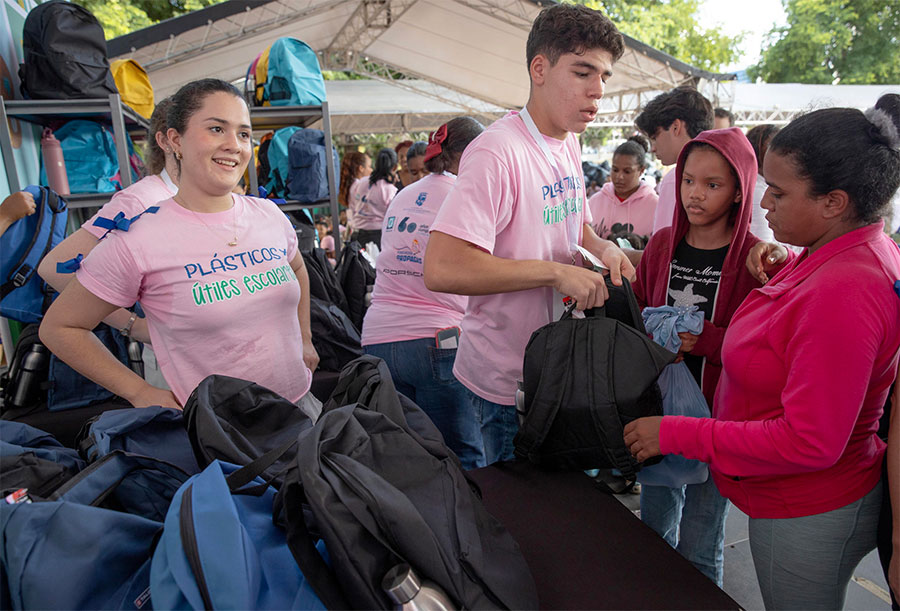 Familias enteras hicieron largas colas cargadas con bolsas repletas de botellitas de plástico, que luego son pesadas y, de ahí, pasan a un escenario que simula el aula de una escuela para recibir los útiles escolares, en medio de música infantil, personajes populares para los niños, payasos, zancudos…