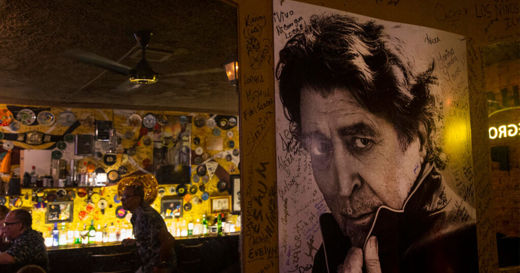 El bar, al lado de uno de los centros culturales más importantes de la capital dominicana, tiene 77 metros cuadrados y en él se han reunido hasta 300 personas a la vez, si se cuenta los apostados en la acera, donde una estatua del cantautor recibe a los clientes sentado en una banca.