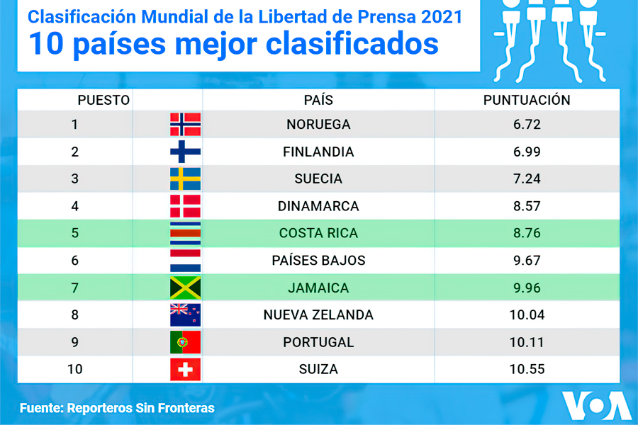 La Voz de América conversó con el director de Reporteros Sin Fronteras para América Latina sobre los desafíos actuales de la prensa en la región. Por quinto año consecutivo, Noruega ocupa el primer lugar en la clasificación mundial sobre libertad de prensa, seguida por Finlandia, Suecia y Dinamarca.