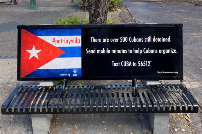 «Todavía hay más de 500 cubanos detenidos. Envíe minutos de móvil para ayudar a los cubanos a organizarse», se lee en el espaldar del banco junto al número al que hay que textear, una bandera de Cuba y #patriayvida.