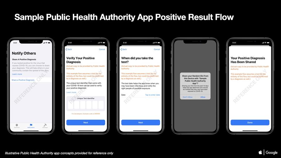Las dos empresas, que la semana pasada abrieron su tecnología a ciertos desarrolladores de software, publicaron este lunes una serie de imágenes en las que puede verse en la pantalla de un móvil cómo serán estas aplicaciones cuando el usuario las abra, cuando le notifiquen que ha estado en contacto con alguien infectado o cuando ellos mismos den positivo por el coronavirus.