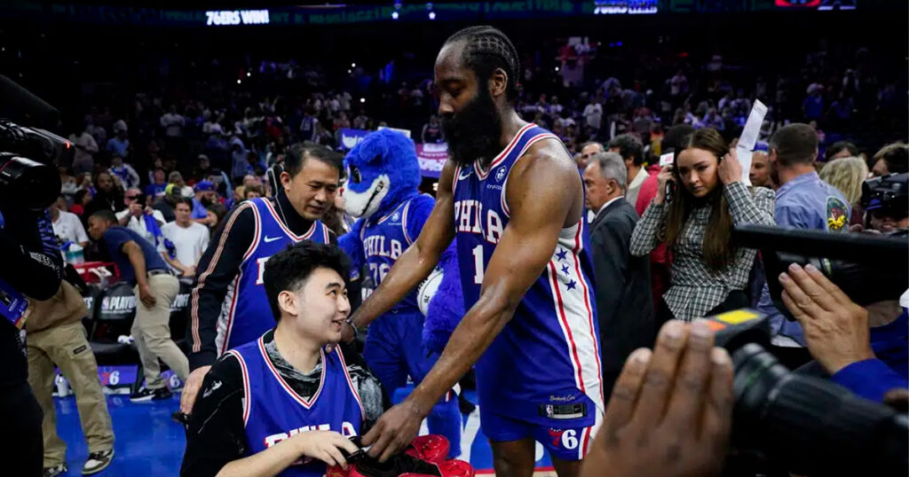 Hao wore Harden’s No. 1 Sixers jersey and attended the game with his parents. Hao’s father also wore a Harden jersey and posed for pictures as the 76ers warmed up behind him.