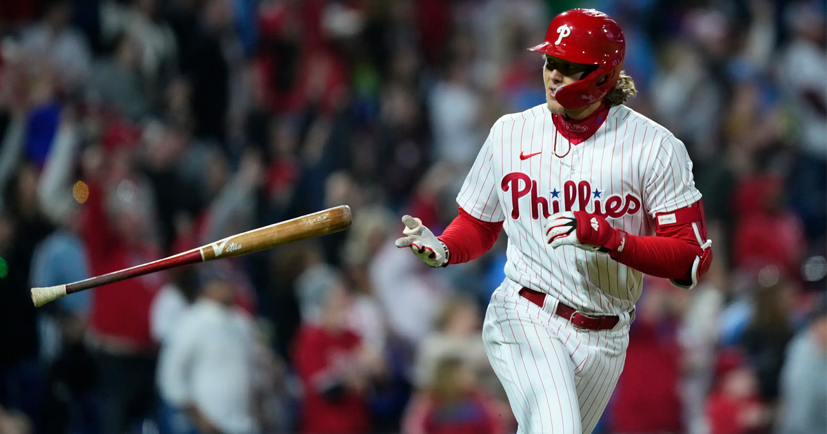 Hitting .429 to start the season, Thomson shifted second baseman Stott to the leadoff spot. Turner was bumped to second and Schwarber hit third. Stott singled in the third and extended his hitting streak to 10 games.