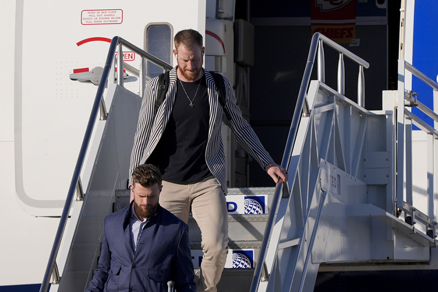 El quarterback de los Chiefs de Kansas City, Carson Wentz, llega al aeropuerto internacional de Nueva Orleans, el domingo 2 de febrero de 2025, en Kenner, Luisiana, antes del partido de fútbol americano del Super Bowl 59 de la NFL entre los Eagles de Filadelfia y los Chiefs de Kansas City. (AP Foto/Gerald Herbert)