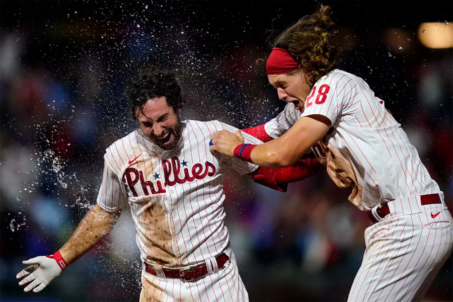 Bryson Stott abrió el décimo inning con un toque de sacrificio para colocar en la antesala al dominicano Yairo Muñoz, corredor automático.