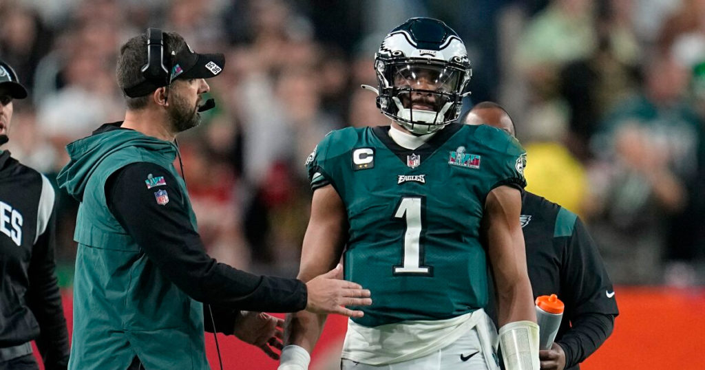 Jalen Hurts isn’t going anywhere. But the franchise quarterback who threw for 304 yards and a touchdown and ran for 70 yards and three scores against the Chiefs can start talking about a new contract. Just not yet.