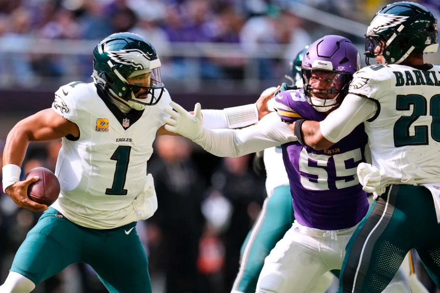 FILADELFIA.— Jalen Hurts descargó algo de frustración al entrar al vestuario de los Eagles después de darle un impulso a su rezagada ofensiva al lanzar para 326 yardas en una victoria sobre Minnesota.