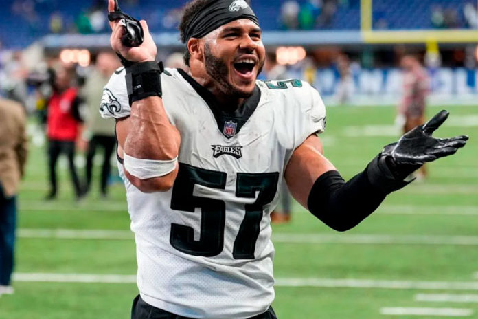 Philadelphia Eagles linebacker T.J. Edwards (57) celebrates as he leaves the field following an NFL football game against the Indianapolis Colts in Indianapolis, Fla., Sunday, Nov. 20, 2022. The Eagles deleted the Colts 17-16. (Photo: AP/AJ Mast)