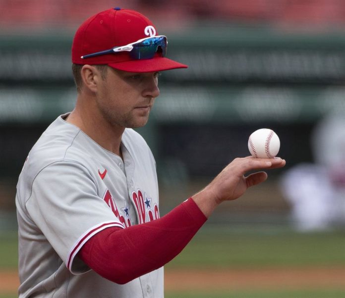 Fotografía de archivo en la que se registró al pelotero estadounidense Rhys Hoskins, primera base de los Filis de Filadelfia. (Foto: EFE/CJ Gunther)