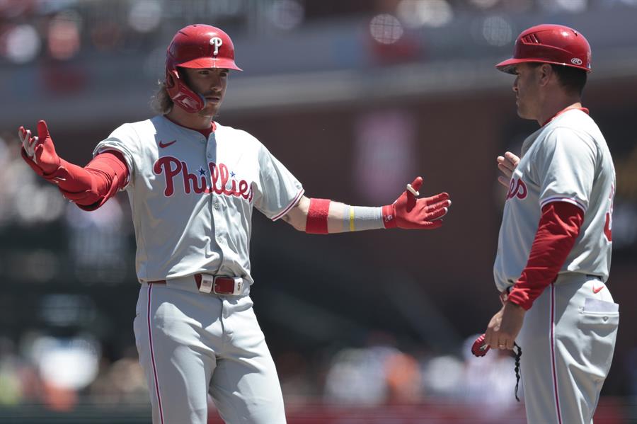 El segunda base de los Filis de Filadelfia Bryson Stott (i) se dirige al ‘dugout’ de su equipo tras batear un sencillo, este miércoles del lanzador de los Gigantes de San Francisco, Kyle Harrison. (Foto: EFE/John G. Mabanglo)