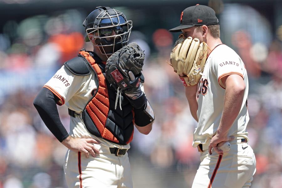 El lanzador de los Gigantes de San Francisco, Kyle Harrison (d), habla con el receptor de los Gigantes de San Francisco, Curt Casali (i), en el montículo de lanzamiento después de que los Gigantes desafiaron una decisión del árbitro de que los Filis de Filadelfia, Bryce Harper, fueron golpeados por un lanzamiento durante la sexta entrada del juego de este miércoles en San Francisco (California) (Foto: EFE/John G. Mabanglo)