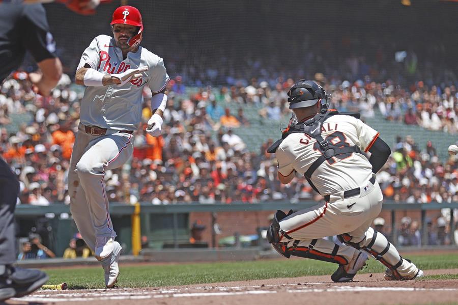 El jardinero derecho de los Filis de Filadelfia Nick Castellanos (i) se dirige al plato para anotar ante el esfuerzo vano del receptor de los Gigantes de San Francisco Curt Casali (d) durante el juego celebrado este miércoles en San Francisco. (Foto: EFE/John G. Mabanglo)