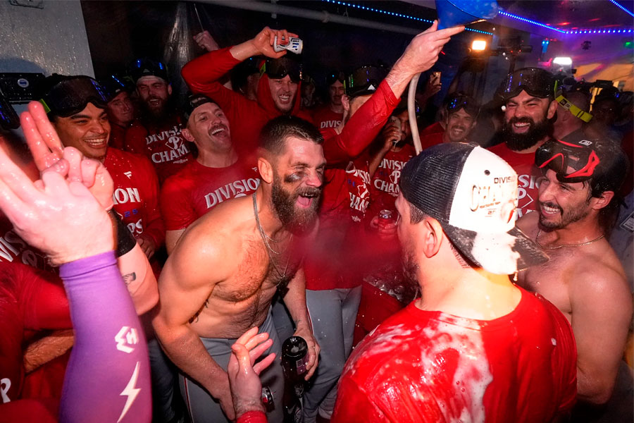 Un Bryce Harper sin camiseta vertió una botella de champán sobre su cabeza, disfrutando del segundo título consecutivo de la División Este de la Liga Nacional de los Filis de Filadelfia.