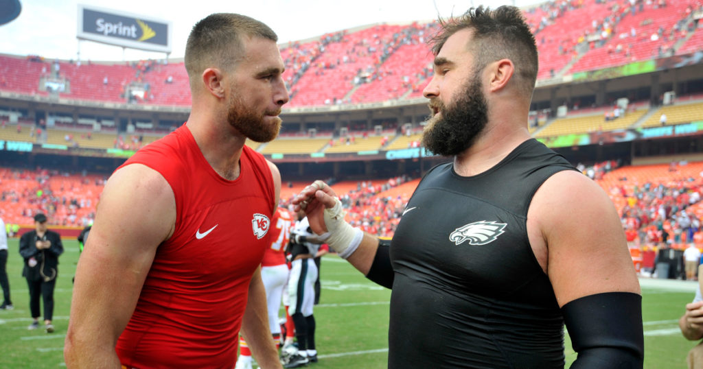 Jason Kelce fue por un efímero momento aficionado de los Chiefs la noche del domingo, poniéndose una sudadera de Kansas City durante las tres horas que pasaron entre el final de la paliza 31-17 que los Eagle le propinaron a San Francisco y el final de la victoria 23-20 de los Chiefs de su hermano ante Cincinnati.
