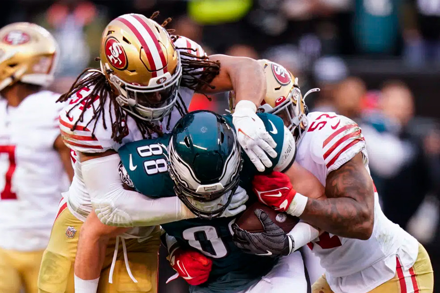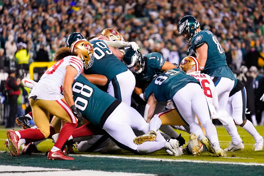 Hurts had one of Philadelphia’s four rushing touchdowns and the Eagles soared into the Super Bowl, forcing both of San Francisco’s quarterbacks out of the game with injuries and beating the wounded 49ers 31-7 in the NFC championship game on Sunday.