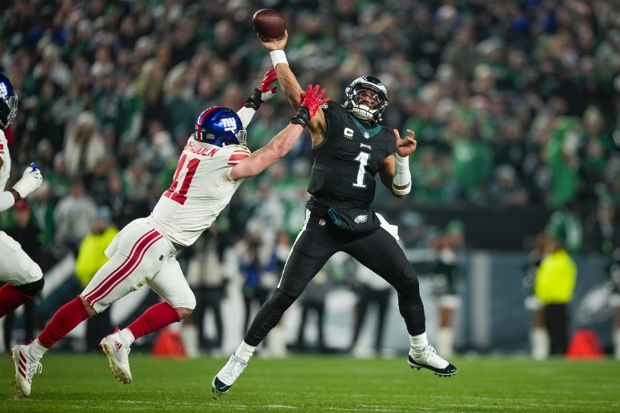Jalen Hurts anotó con la jugada conocida como “tush push” y con lo que logró el récord de más touchdowns para un quarterback en una temporada, lanzó para otra anotación y los Eagles de Filadelfia siguen en la pelea por el título de la División Este de la Conferencia Nacional al vencer 33-25 el pasado lunes a los Giants de Nueva York.