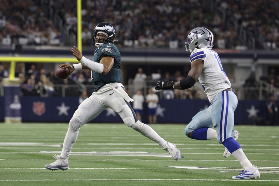 ARLINGTON, Texas, EE.UU.— Jalen Hurts lanzó dos pases de touchdown y corrió para anotar un par de veces más, mientras que los Eagles de Filadelfia se impusieron 34-6 a los desafortunados Cowboys el domingo, en el primer juego desde que el quarterback de Dallas, Dak Prescott, sufrió un desgarro en el músculo isquiotibial.