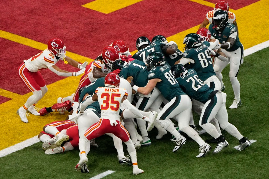 El quarterback Jalen Hurts (1) de los Eagles de Filadelfia es empujado para anotar un touchdown ante los Chiefs de Kansas City en el Super Bowl, el domingo 9 de febrero de 2025, en Nueva Orleans. (Foto: AP/Charlie Riedel)