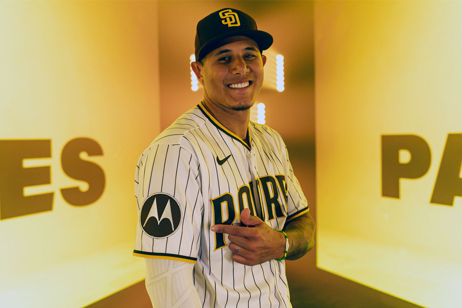 En esta foto distribuida por los Padres de San Diego, el tercera base Manny Machado señala el logo de Motorola pegado a su manga en Peoria, Arizona, 18 de marzo de 2022. Los Padres de San Diego anunciaron un acuerdo con Motorola el 19 de abril de 2022: Serán el primer equipo del béisbol estadounidense que lucirá publicidad en su uniforme. Selló el acuerdo después de que se aprobase la publicidad en la manga derecha y el casco. (Foto: APMatt Thomas/San Diego Padres)