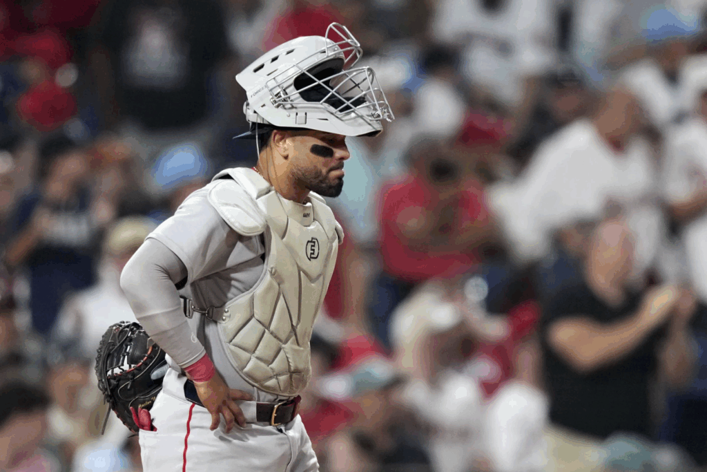Boston Red Sox catcher Carlos Narváez waits for umpires to call catcher’s interference on him during an at-bat by Philadelphia Phillies’ Edmundo Sosa with the bases loaded during the 10th inning of a baseball game Monday, July 21, 2025, in Philadelphia. (Photo: AP/Matt Slocum)