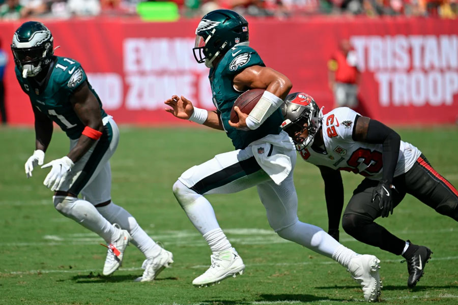 Jalen Hurts (1), quarterback de los Eagles de Filadelfia, trata de superar al safety Tykee Smith (23), de los Buccaneers de Tampa Bay, ante la mirada de A.J. Brown (11), durante la segunda mitad del partido de la NFL, el domingo 28 de septiembre de 2025, en Tampa, Florida. (Foto: AP/Jason Behnken)