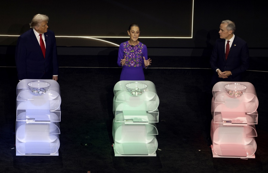 Trump, Sheinbaum y Carney fueron invitados a subir juntos al escenario para extraer del bombo las bolas correspondientes a sus países, una imagen histórica que evocó la ‘Cumbre de los Tres Amigos’, que en su día reunía a los líderes norteamericanos y que no parece que vaya a celebrarse durante el mandato del republicano.