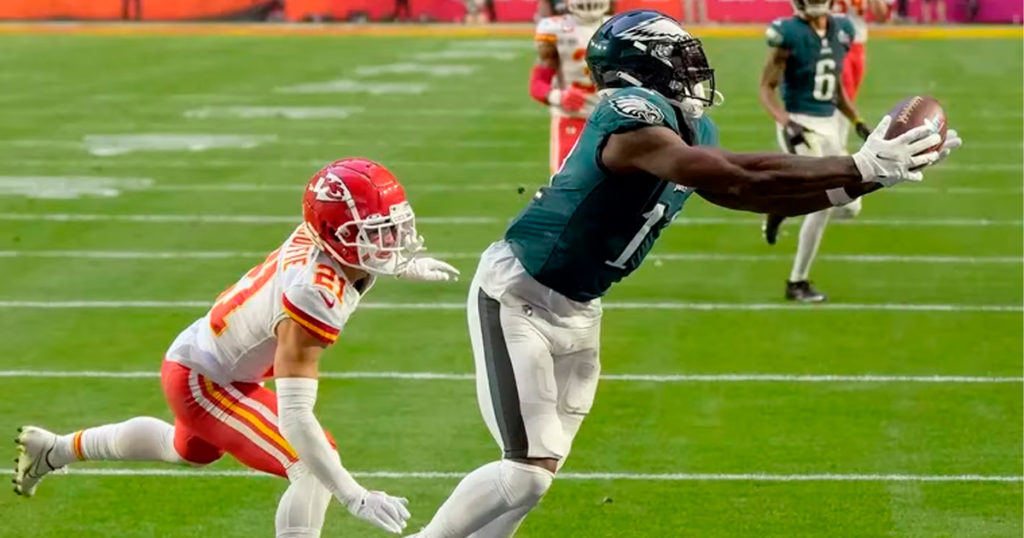 On the first play of the second quarter, Hurts lofted a 45-yard throw toward the end zone. Brown outmaneuvered the scrambling Kansas City defense before catching the ball and then raising his arms to flex his muscles.