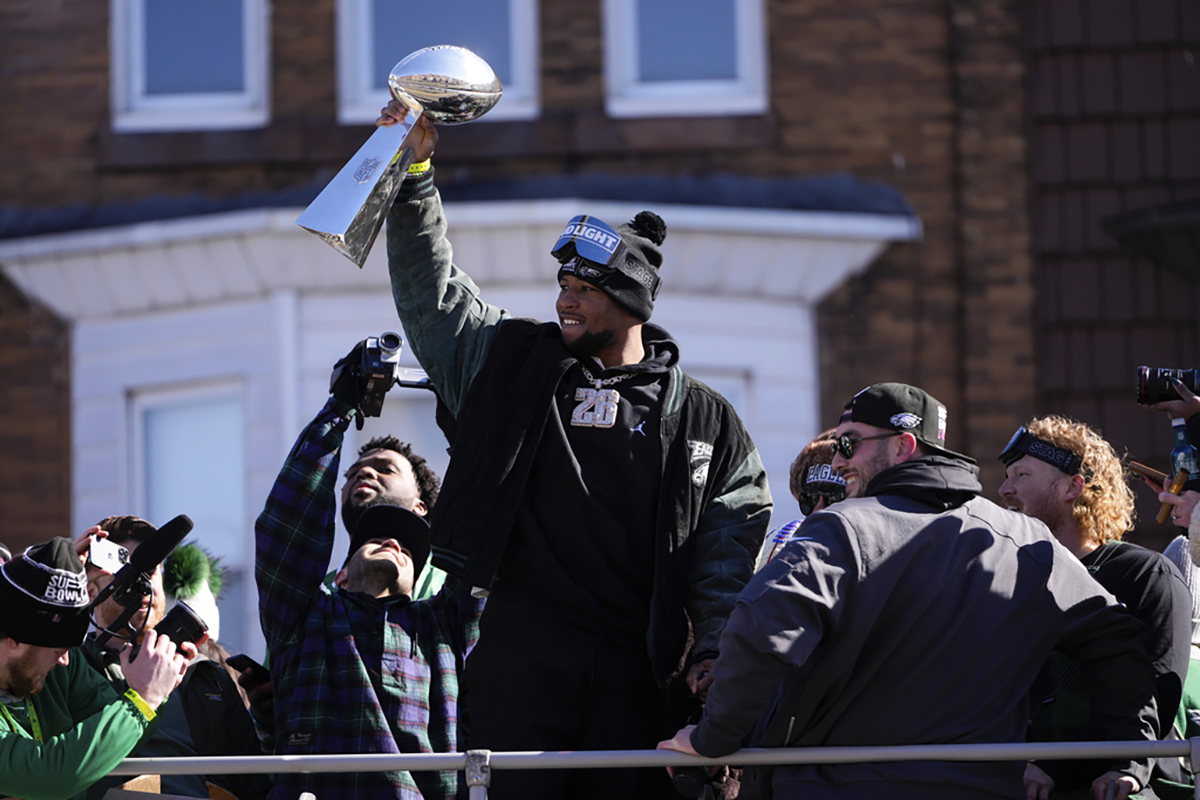 Otros aficionados, vestidos con camisetas de los Eagles, treparon a los árboles y postes de luz, se colocaron en lo alto de escaleras y se aferraron a una estatua de Benjamin Franklin cerca del Palacio del Ayuntamiento para vislumbrar a Saquon Barkley, el corredor con más yardas terrestres en una temporada en la NFL, y a Cooper DeJean, el novato defensivo que llevó una intercepción hasta la zona de anotación el día en que cumplió 22 años.