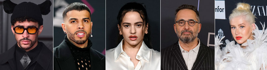 En esta combinación de fotografías, Bad Bunny, de izquierda a derecha, Rauw Alejandro, Rosalía, Jorge Drexler y Christina Aguilera. Bad Bunny conocerá si se lleva alguno de los 10 Latin Grammy para los que está nominado el jueves 17 de noviembre. Rauw Alejandro, nominado a ocho premios, Rosalia, Jorge Drexler y Aguilera, nominados cada uno a siete premios, tendrán números musicales en la ceremonia que se transmitirá en vivo desde Las Vegas a partir de las 8 pm de Nueva York. (Foto: AP)