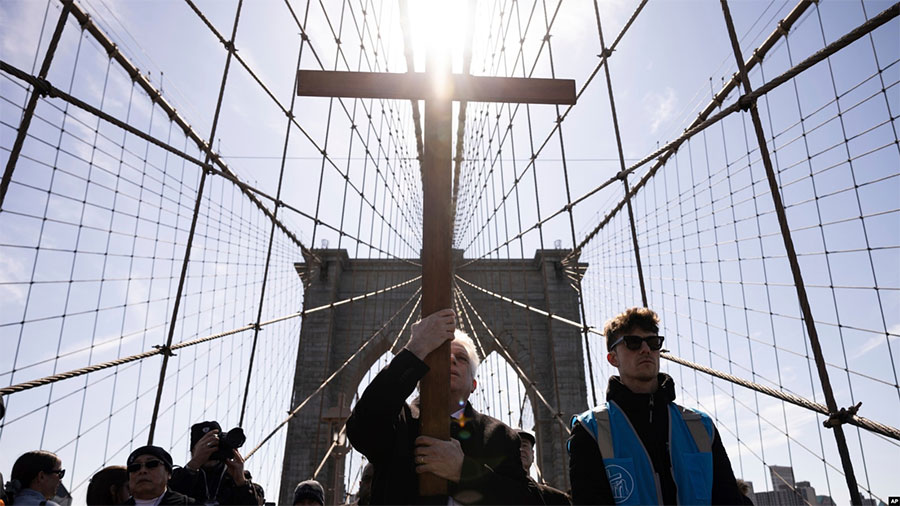Un viacrucis avanza sobre el Puente de Brooklyn después de salir de la Basílica Catedral de St. James, para conmemorar el Viernes Santo y el inicio del fin de semana de Pascua, el 29 de marzo de 2024 en Nueva York, EE. UU. (Foto: AP)
