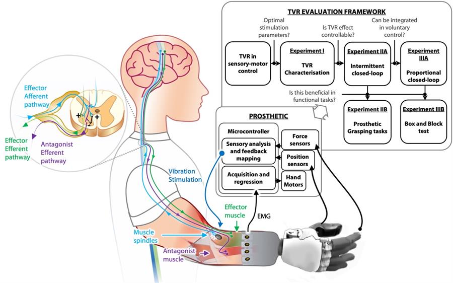 Los científicos han encontrado la forma de controlar la contribución de los reflejos espinales en el control neuronal de una prótesis de mano, y para conseguirlo proponen el uso de la estimulación nerviosa mediante la vibración localizada de los tendones asociados con la tarea motora que se quiere realizar.