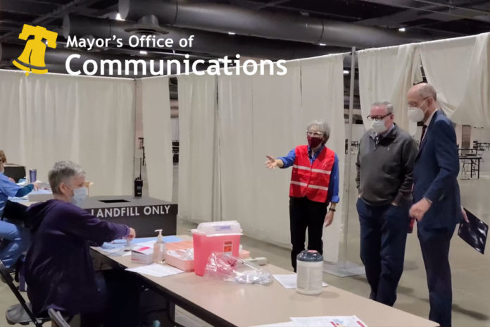 El alcalde Kenney y el comisionado de salud Dr. Thomas Farley visitaron hoy la clínica de vacunación COVID-19 del Departamento de Salud Pública en el Centro de Convenciones de Pensilvania