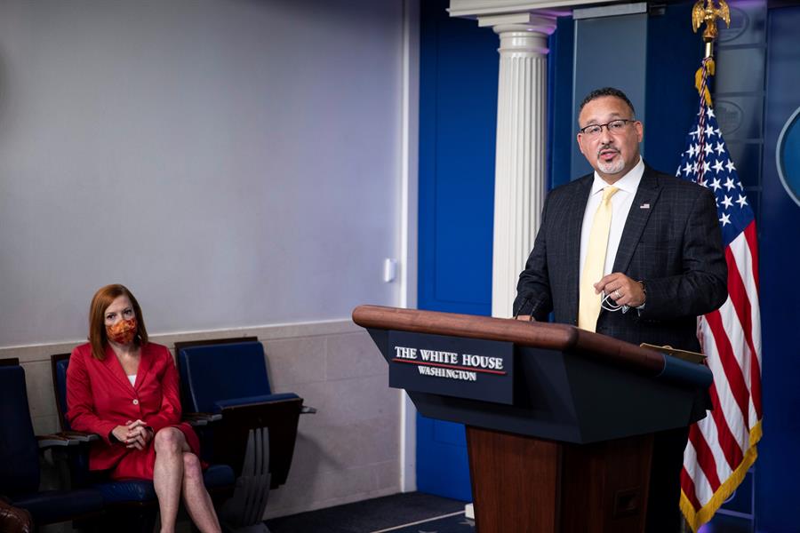 En rueda de prensa en la Casa Blanca, el secretario de Educación, Miguel Cardona, defendió la vuelta a las aulas a pesar de la expansión de la variante delta, responsable del 93 % de los contagios de covid-19 en el país, porque según subrayó la comunidad escolar cuenta con las «herramientas» y los «recursos» para garantizar una educación presencial «segura».